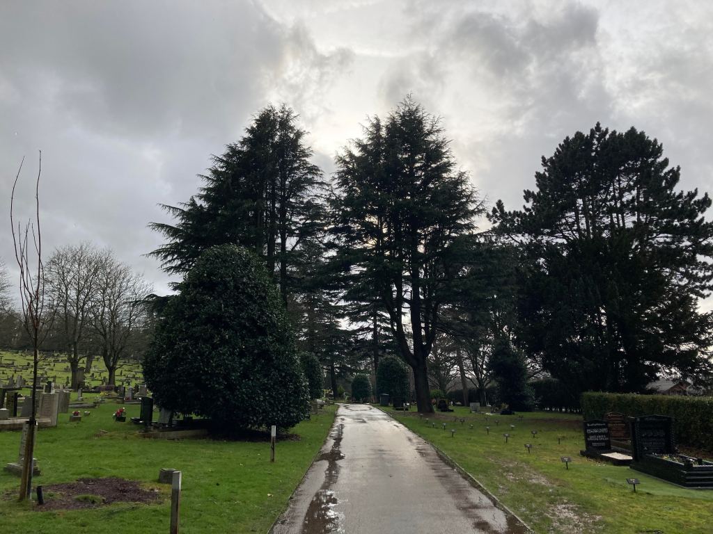 An elderly lady, drenched, head concealed by a hood, scurried down the hill toward her home, her wellies half-in the sloshy earth. I realised I wouldn’t be cycling up there on two wheels today. I proceeded round the fancy estate, and out towards the main road. There is a graveyard on a hill as you enter the borough, which boasts excellent views. As a jonny who particularly delights in observing cities from a decent vantage point, I cycled all the way past the graves and the perfect Lego fir trees, and to the top of the hill where the church sat. I don’t know why, but as I peered up at the tower, I had a vivid image of a Monk, concealed by long black robes appearing briefly in the steeple window, and then disappearing.
